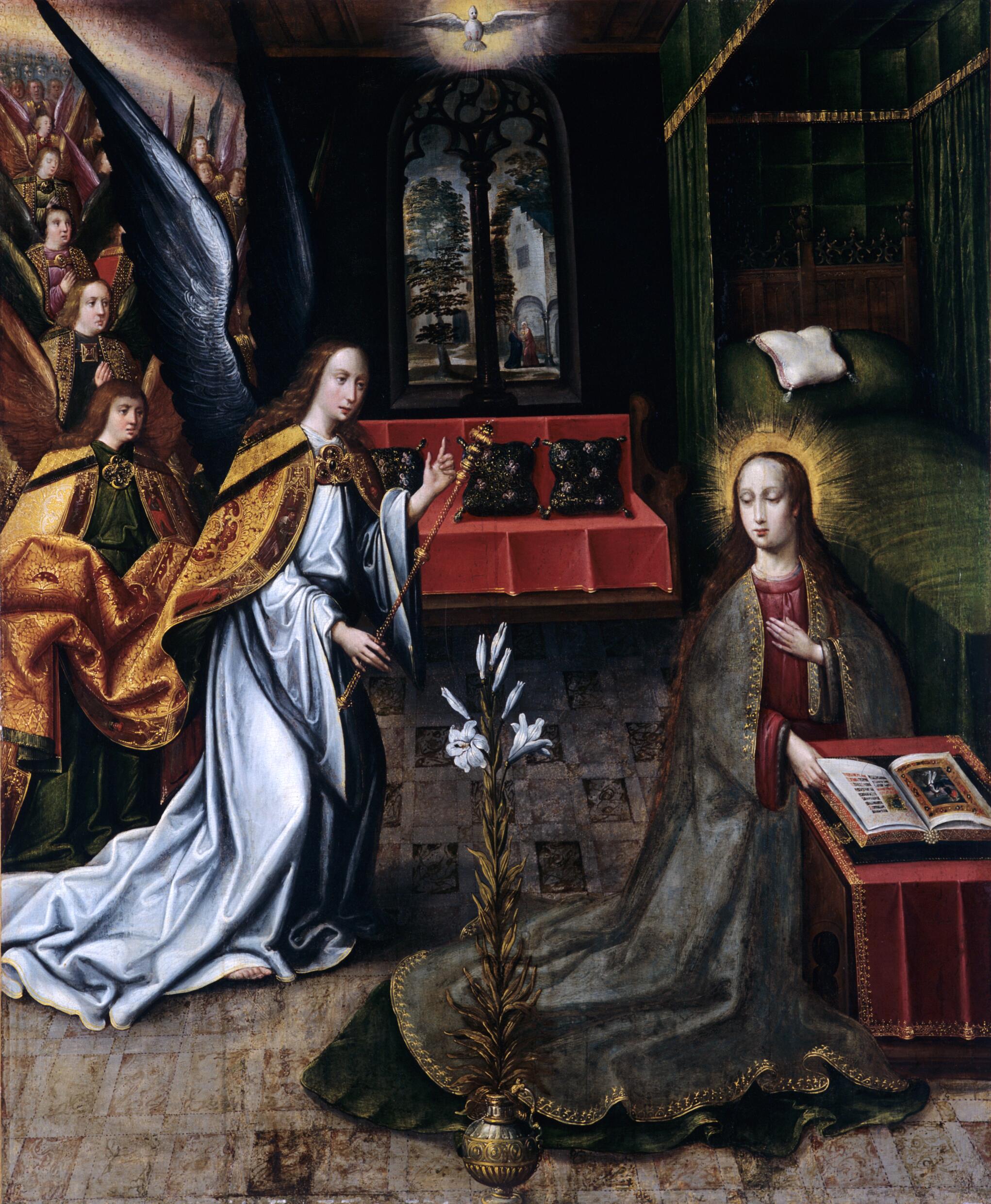 Une scène clé du récit biblique se déroule dans un riche intérieur des Pays-Bas du 16e siècle : l’archange Gabriel est venu annoncer à la Vierge Marie qu’elle portera le fils de Dieu.