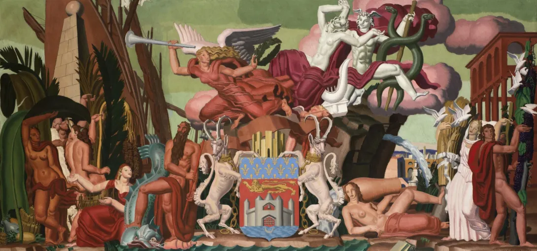 Quatre peintres bordelais - Jean Dupas (1882-1964), François-Maurice Roganeau (1883-1973), Jean Despujols (1886-1965) et Marius de Buzon (1879-1958), tous issus de l’enseignement académique de l’École municipale des beaux-arts et premiers Grands Prix de Rome pour trois d’entre eux, participent au décor du Pavillon de Bordeaux.