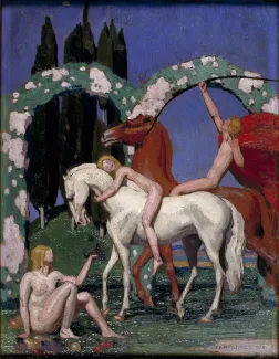 Exécuté en 1917, L’Archer pose les jalons de cette nouvelle esthétique. Servie par un dessin ingresque et des couleurs froides posées en aplats, la composition campe un décor de poème champêtre antique à l’artifice théâtral.