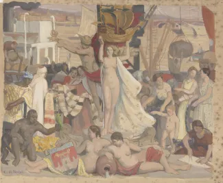 Dominée au centre par la figure triomphale de la Renommée surmontant les armoiries de la ville, la composition est rythmée par des divinités de la mythologie grecque et romaine et des allégories renvoyant à l’identité et aux richesses locales. Le mouvement joyeux des personnages et le chromatisme chaleureux, aux tonalités contrastées, participent à cette glorification quelque peu débridée.