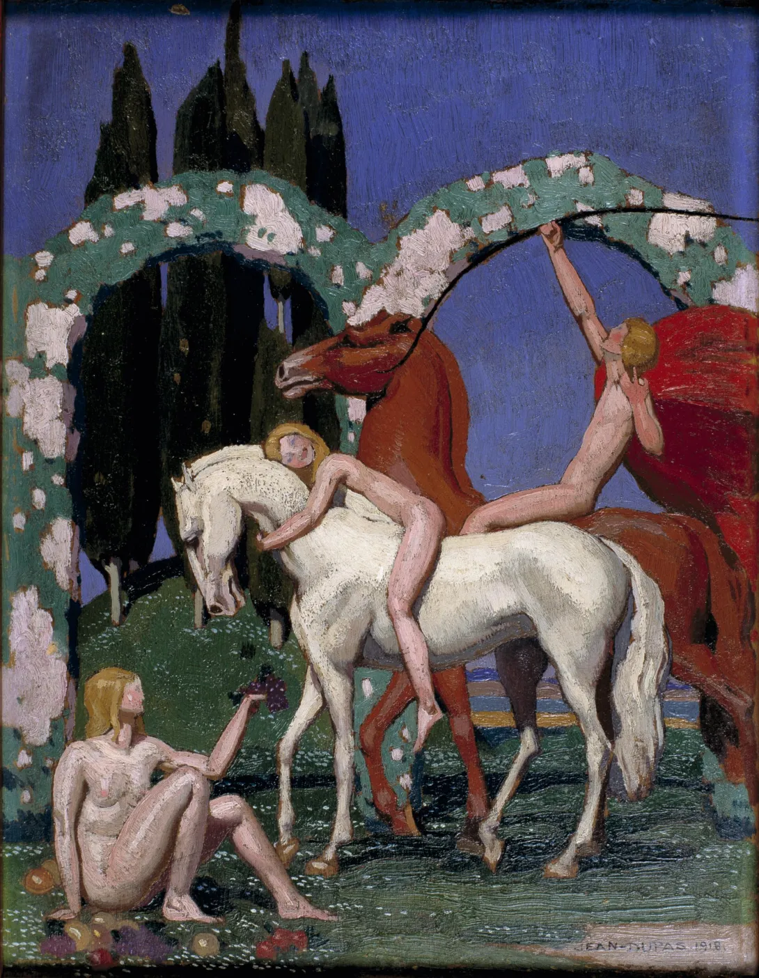 C’est au cours de son séjour à la Villa Médicis, en 1910, que Dupas découvre le double héritage de l’Antiquité et de la Renaissance. Le Bordelais développe rapidement un art profondément singulier, où les réminiscences du maniérisme italien, que traduisent notamment le raffinement du coloris et l’élongation extrême de ses figures mythologiques, s’allient à des emprunts au cubisme dont il reprend la géométrisation et la stylisation formelles. Ce néoclassicisme sophistiqué déconcerte ses contemporains mais séduit ses condisciples bordelais.