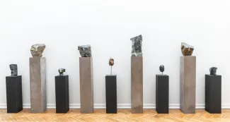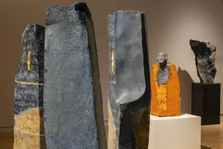 À l’exception d’une œuvre de jeunesse réalisée en terre et récemment fondue en bronze (Portrait de Kafka, 1983), toutes les pièces exposées s’échelonnent de 2010 à 2023, années marquées par l’entrée de l’artiste à la galerie Claude Bernard à Paris. Il s’agit d’une étape charnière dans la carrière de Denis Monfleur qui élargit alors son vocabulaire plastique par l’utilisation de nouvelles techniques et de nouveaux matériaux comme les laves, le basalte, les orgues basaltiques ou encore la diorite. Il explore aussi les riches possibilités de la polychromie, avec un travail poussé sur les patines et développe une technique inédite d’émaillage de lave volcanique.