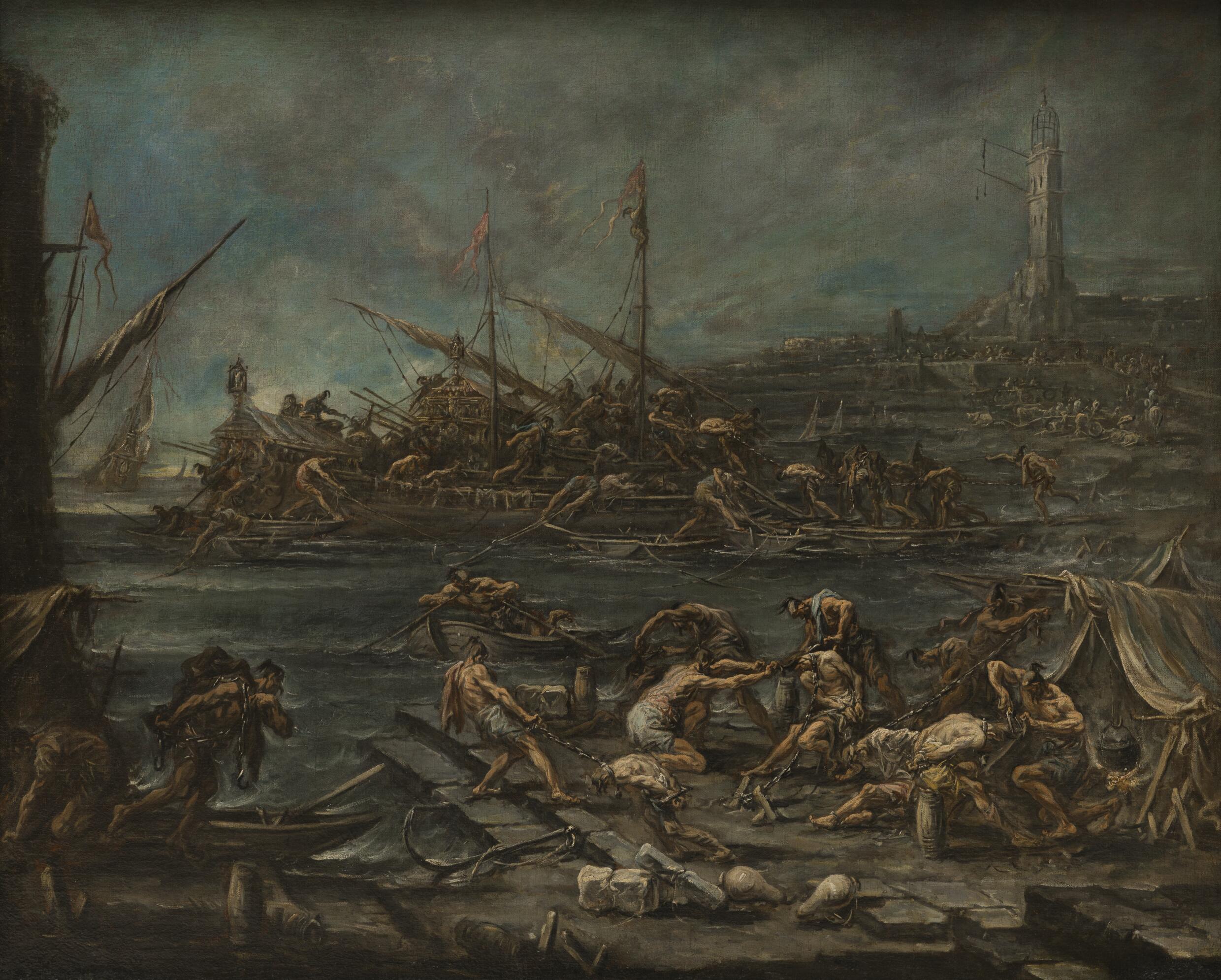 Magnasco traite deux moments successifs de l’incarcération des galériens au bagne de Gênes. Le premier tableau représente l’arrivée des prisonniers, enchaînés et traînés par les gardes à cheval, afin de subir un interrogatoire dans la cour du bagne. Au centre, un homme condamné au supplice de l’estrapade - l’accusé est suspendu à une corde - permet au greffier attablé de recueillir ses aveux. Au fond du tableau, d’autres prisonniers arrivent sous le regard de badauds penchés à une balustrade. Le deuxième tableau illustre le moment où les prisonniers sont rasés et marqués au fer rouge avant d’être embarqués sur les galères. Le haut phare (du Capo di Faro) situe sans conteste la scène dans le port de Gênes.