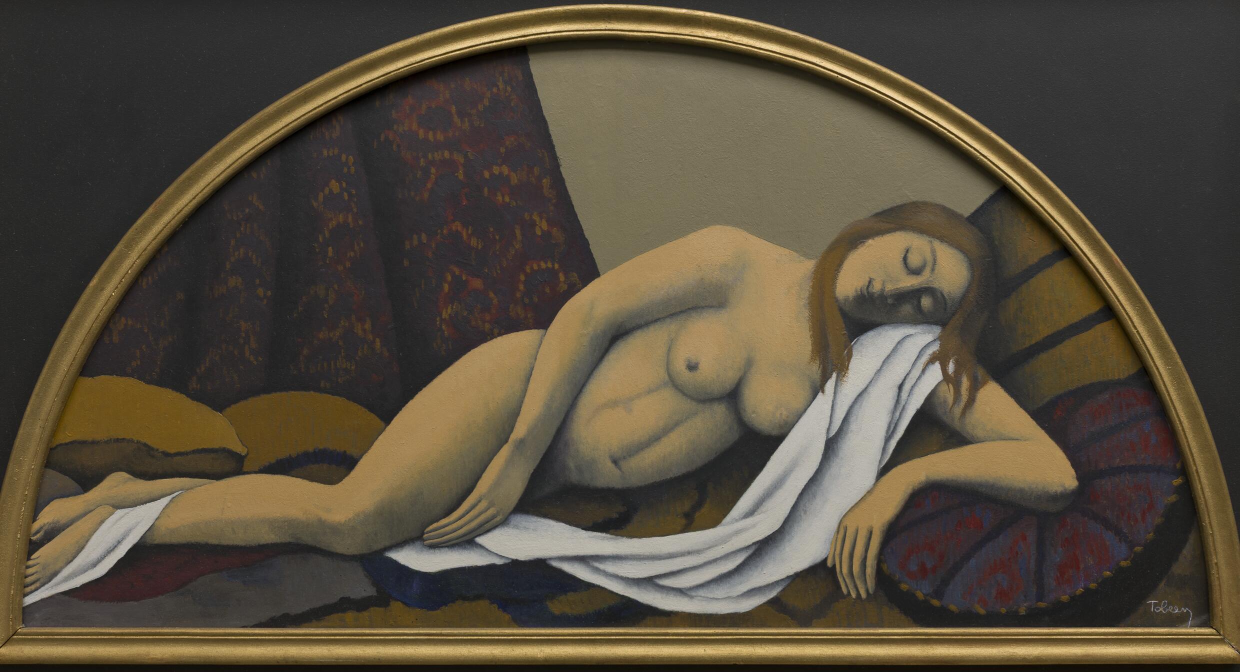 En quête d’équilibre et de sérénité que les paysages de la baie de Somme lui inspirent alors, Tobeen compose ici une scène stylisée à l’extrême. Dans ce nu post-cubiste dont le visage ovoïde n’est pas sans rappeler celui de la Muse endormie de Brancusi, la forme est réduite à l’essentiel. L’utilisation d’une gamme chromatique sobre, réduite à de chaudes tonalités de bruns et d’ocres, renforce ce sentiment d’intimité sensuelle que souligne encore l’arabesque du corps aux courbes généreuses faisant écho à l’arrondi des coussins et aux ondulations du drapé.