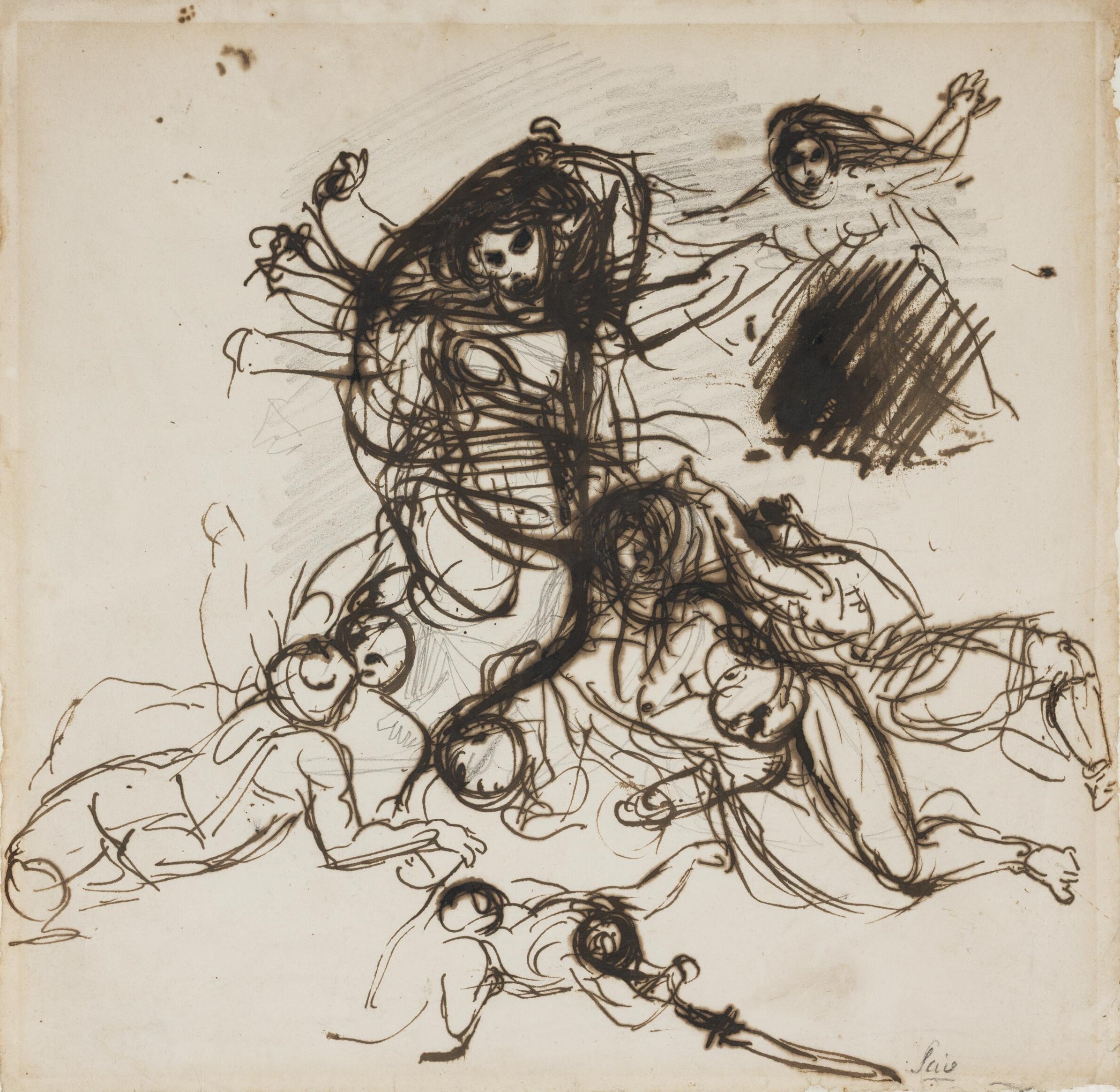 À l’aube du Romantisme, nombre d’artistes comme Eugène Delacroix, ainsi que des écrivains européens tels que Victor Hugo, Chateaubriand et Lord Byron, s'enthousiasmèrent pour la cause philhellène qui trouvait un écho politique à leur propre quête de liberté artistique. Ce dessin de Delacroix révèle avec brio le romantisme enfiévré de l’artiste et sa virtuosité à traduire l’expression d’une résistance désespérée. Les multiples positions des bras et les furieux enchevêtrements de traits de plume expriment le combat héroïque des quatre mille défenseurs de Missolonghi, encerclés par une armée d’ennemis.