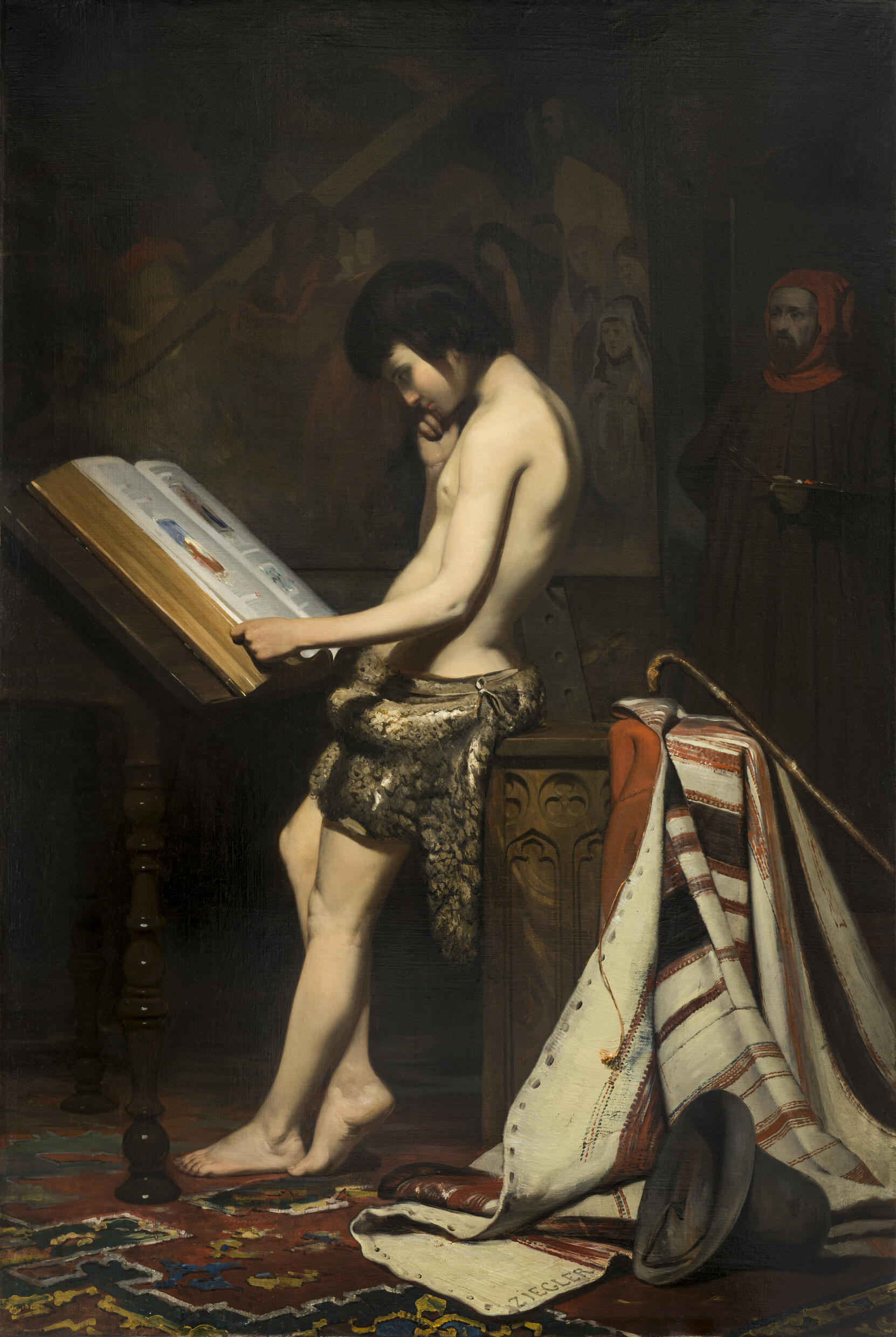 Dans cette peinture, Ziegler imagine l’éveil artistique de Giotto au moment où il est invité à pénétrer pour la première fois dans l’atelier de son futur maître, Cimabue. Le petit berger, qui a abandonné son manteau, son chapeau et sa houlette, est totalement absorbé dans la contemplation d’un manuscrit enluminé.