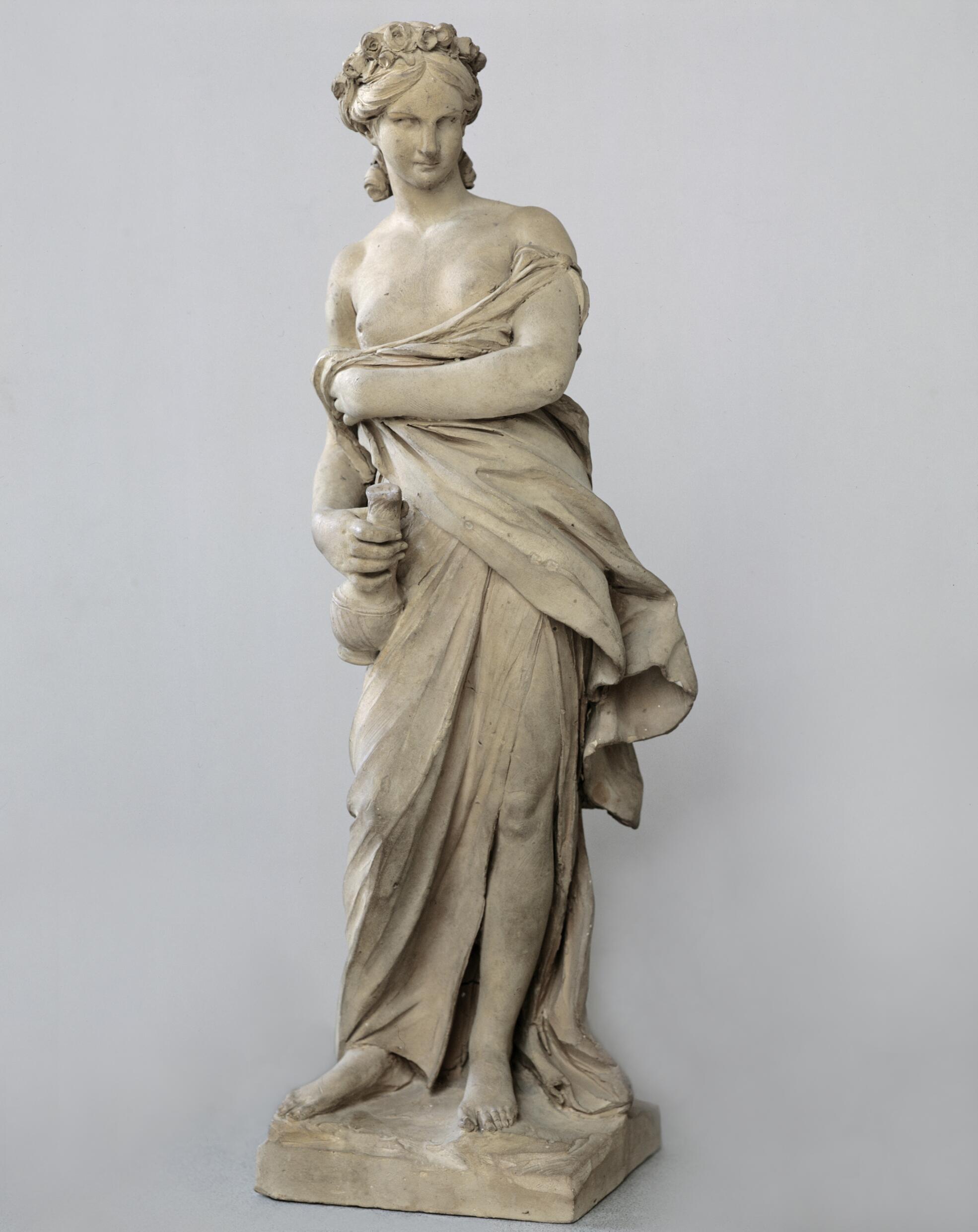 Pierre-François Berruer capture avec délicatesse l’élégance et la fraîcheur de Hébé, déesse de la jeunesse et échanson des dieux. Représentée en mouvement, elle semble descendre doucement du ciel, tenant la coupe du nectar divin. Son léger déséquilibre et la fluidité de son drapé confèrent à la sculpture une grande légèreté, soulignant la grâce aérienne du personnage.