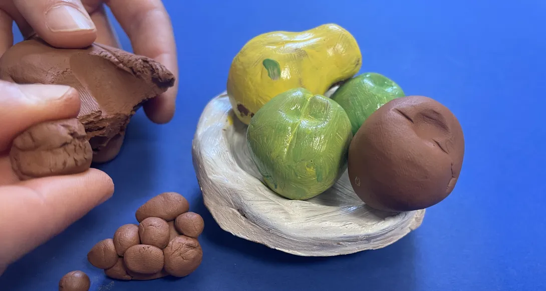 Puis modèle des fruits avec ton argile ou ta pâte à sel. Attention, ils doivent être adaptés à ton contenant ! Ne les fais donc pas trop gros.