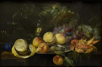 Tu as devant toi une œuvre du 17e siècle. Elle a plus de 350 ans ! Elle a été peinte par Jan Van Kessel et elle s’intitule Nature morte aux fruits et crustacés.