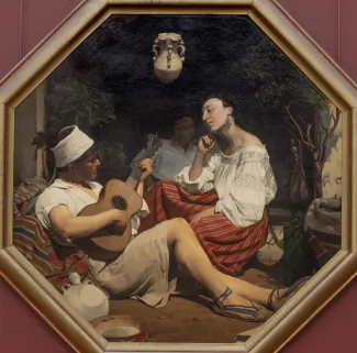 Dans cette scène, au premier plan, nous voyons une femme et un homme, détendus. Ils portent des costumes traditionnels du nord de l’Espagne. La femme écoute attentivement l’homme qui est en train de jouer de la guitare. Elle sourit et se touche l’oreille. L’homme qui joue de la guitare la regarde. En Espagne, le soleil peut être très chaud et on se sert d’éventails pour se rafraîchir.