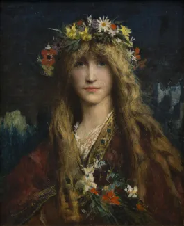 Ophélie est un personnage tiré d’une pièce de théâtre (Hamlet de Shakespeare). Très amoureuse de son amant, elle apprend qu’il est le meurtrier de son propre père. Folle de chagrin, elle se noie dans une rivière. Ophélie est peinte ici comme une jeune fille blonde couronnée de fleurs des champs, vêtue d’un manteau pourpre bordé d’or, tenant un bouquet de fleurs, le visage illuminé d'une douce lumière, et le regard comme perdu en lui-même.