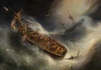 Cette peinture romantique est un tourbillon de mer déchaînée. Le peintre, grand connaisseur de la mer, rapporte un haut fait, réel, d'un capitaine bordelais portant secours à un navire hollandais en pleine tourmente. Un tableau qui représente une scène en mer s’appelle une marine.