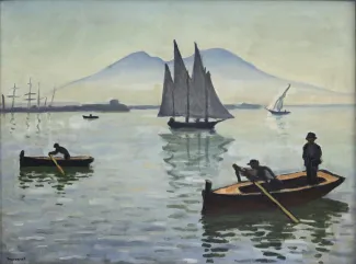 Albert Marquet est un artiste girondin qui a beaucoup voyagé. Il aime beaucoup sa région d’origine et adore se rendre du côté d’Arcachon et de la dune du Pyla pour représenter les plages et les pins. Mais il a aussi voyagé plus loin : en Allemagne et en Angleterre, en Algérie, en Tunisie, au Maroc et dans bien d’autres pays. Il visitera notamment l’Italie avec ses amis. Ici, on aperçoit une montagne italienne en arrière-plan : il s'agit d'un volcan, le Vésuve, à côté de la ville de Naples. Au centre du tableau, un grand voilier, avec trois mâts, se reflète dans l’eau. Albert Marquet a une manière bien à lui de représenter l’eau : il fait de petites touches en forme de traits. Chaque trait porte une couleur et c’est l’ensemble qui crée les contrastes et les vaguelettes.