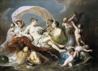 Parmi les personnages importants de ces histoires, il y a Vénus, la déesse de l’amour et de la beauté pour les Romains (appelée Aphrodite par les Grecs). Certains racontent qu’elle serait née dans la mer, dans un coquillage. Le Triomphe de Vénus est un tableau peint il y a plus de 250 ans. Il s’inspire de l’histoire du premier voyage de Vénus, juste après sa naissance. Poussée par le vent, elle se rendit sur deux îles en Méditerranée : d’abord jusqu'au rivage de Cythère, puis à Chypre.
