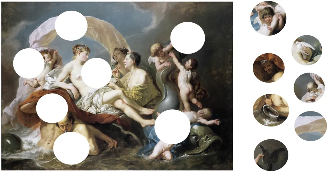 Assemble le puzzle puis, quand tu es bien sûr de toi, colle les ronds colorés aux bons emplacements sur le tableau ! Une fois l’œuvre achevée, essaye de retrouver tous les personnages dont nous avons parlé : Vénus, les amours, les nymphes, les tritons et le dauphin. Ce dernier est un petit peu bizarre… L’artiste n’en avait probablement jamais vu de sa vie !