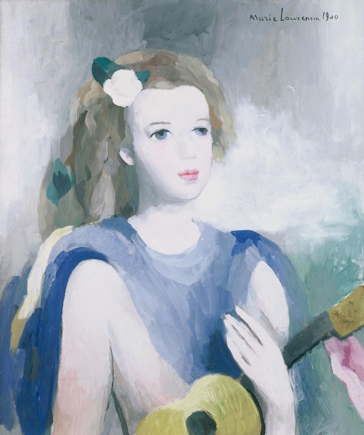 La composition met en scène une jeune femme jouant de la guitare, un motif récurrent chez l’artiste et ses amis cubistes, évoquant à la fois la mélancolie et l’intimité. L’arrière-plan est traité de manière épurée, sans perspective marquée, avec une atmosphère feutrée où l’espace semble flotter autour du sujet. L’artiste privilégie ici une vision idéalisée de la féminité, caractéristique de son travail de l’entre-deux-guerres et des décennies suivantes.