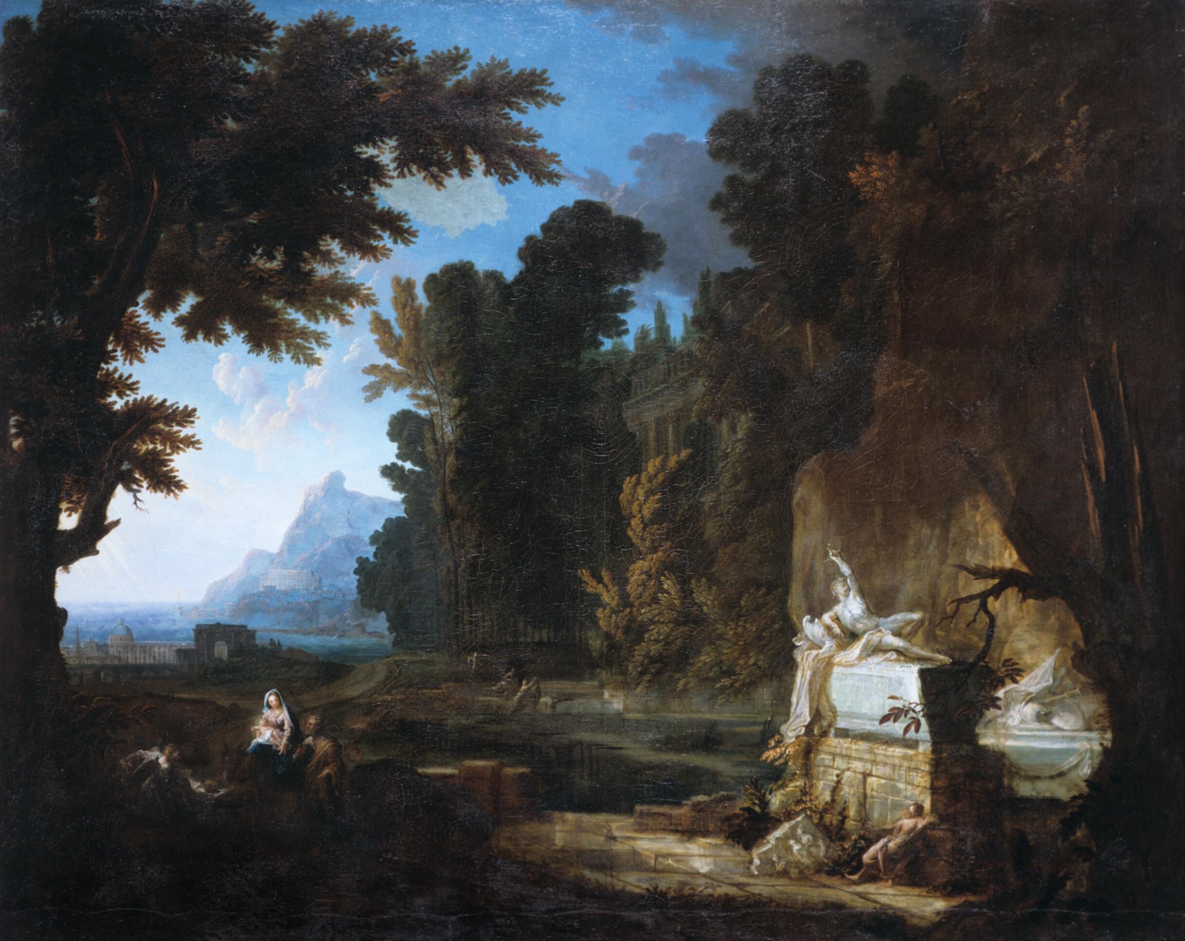 Allegrain ne déroge pas à l’iconographie traditionnelle, avec un ange en adoration, mais il réduit presque la Sainte Famille à de simples voyageurs traversant un paysage. L’œuvre témoigne de l’influence de Poussin et du Lorrain, et présente des références italiennes et antiques : la basilique, les arènes, l’obélisque ou les deux tombeaux de guerriers.