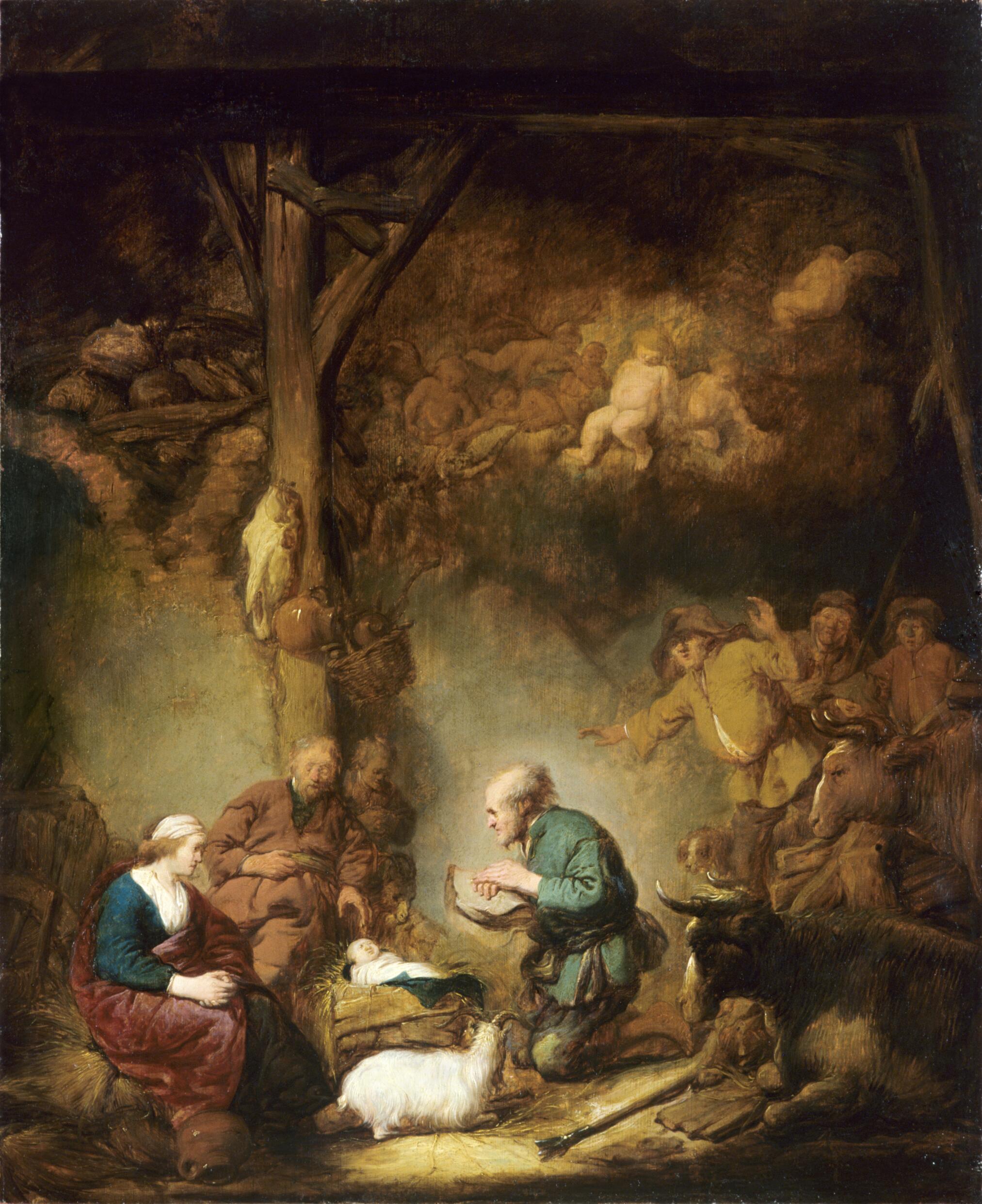 Cuyp témoigne de sa prédilection à représenter la Nativité, surtout l’Adoration des bergers avec une trentaine de versions connues mais difficilement datables. Un détail est inhabituel : le crâne animal accroché au poteau, sans doute une allusion à la Mort et à l’Impureté que le Christ vaincra. En revanche, saint Joseph est représenté en vieil homme endormi (image de sa mort prochaine ?), sous ses outils de charpentier posés dans un panier accroché au poteau. Les animaux rappellent la future mission pastorale de l’enfant mais l’âne est absent.