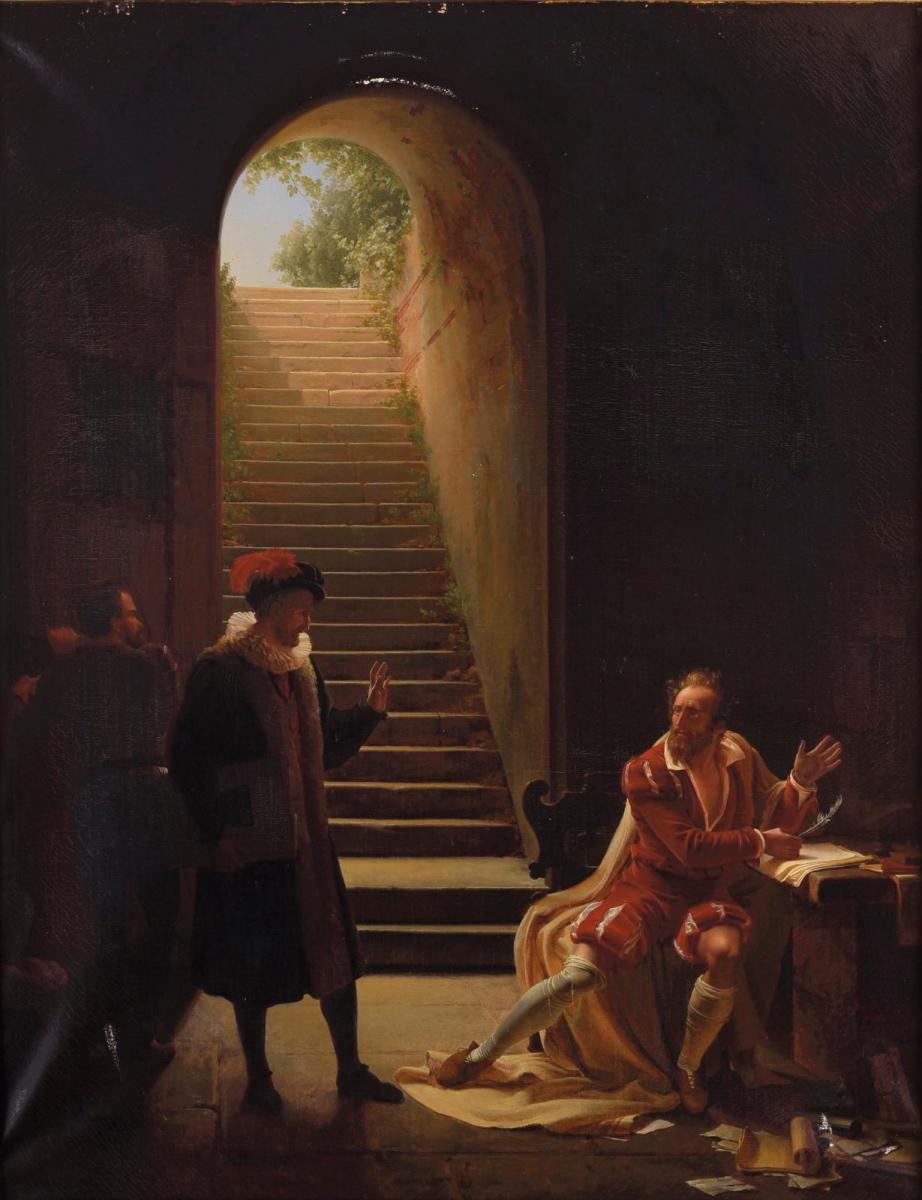 La scène représentée se réfère ici à un fait historique avéré : la rencontre entre Montaigne et Le Tasse en 1581.