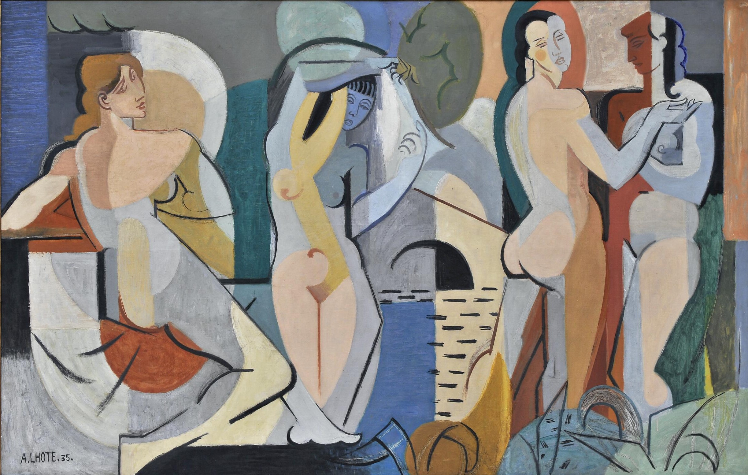 Il choisit ici une composition en frise, rythmée verticalement par une succession de plans colorés traversant les corps des baigneuses. L’utilisation d’un trais épais synthétise le dessin et dissocie les couleurs entre elles. Les aplats colorés, les formes anguleuses de certaines parties du corps rappellent le langage cubiste adopté par Lhote à partir de 1912. Ce n’est pas un hasard, dès lors, si le peintre fait référence aux Demoiselles d’Avignon de Picasso dans plusieurs de ses tableaux mettant en scène des marins et des prostituées.