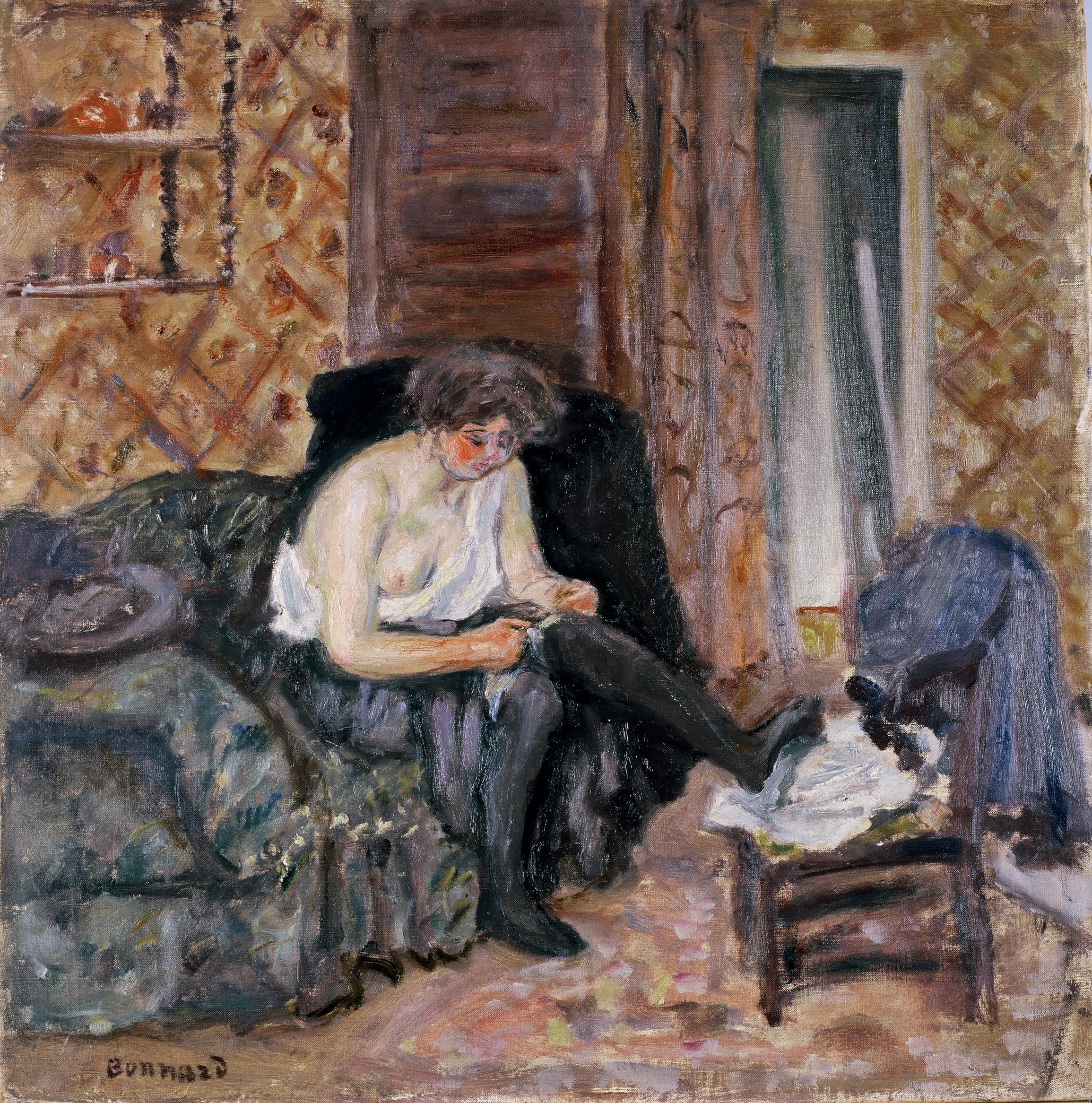 Le sujet d'une femme ajustant ses bas avait déjà été traité par d’autres artistes, notamment Edgar Degas (1834–1917) et Henri de Toulouse-Lautrec (1864–1901) quelques années auparavant. Toutefois, Bonnard le reprend ici différemment et se plaît à évoquer, avec une spirituelle négligence, le décor de l'intimité féminine. À partir des années 1890, l’artiste s'inspire des estampes japonaises, auxquelles il doit son goût pour certains motifs décoratifs – comme le papier peint des murs –, ainsi que pour les perspectives plongeantes et les cadrages audacieux.