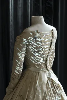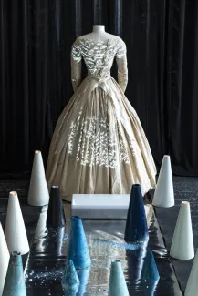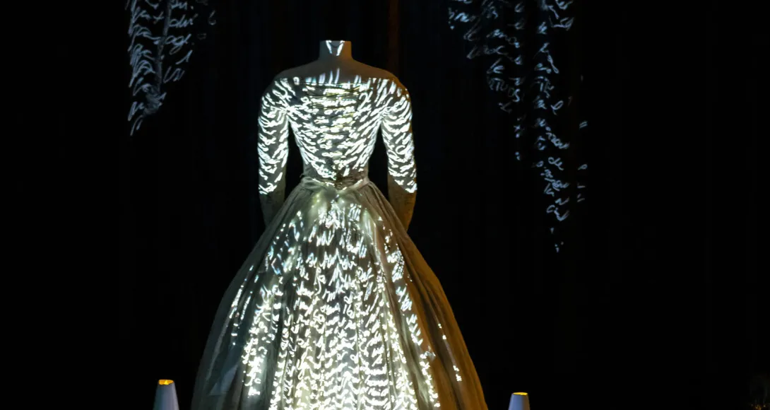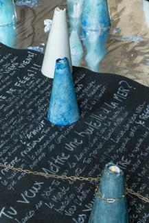 Ici, Orbe(s) prend la forme d’une installation hybride où le visiteur est invité à se laisser immerger par le texte. Les motifs manuscrits tissent un poème, qui tapisse la berge imaginaire, forme une onde flottante sur la robe de la Comédie Française et s’écoute dans une sieste sonore au tempo anachronique, où la voix de l’artiste se mêle au violon de Paul Lazar.
