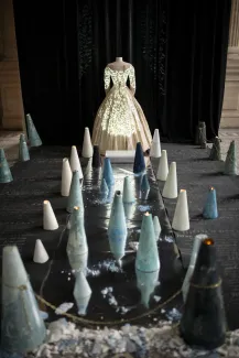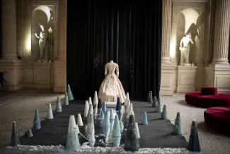 Les fées en albâtre, inspirées des cônes funéraires égyptiens, sont les « veilleuses poétiques » et délimitent le visible et l’invisible.
