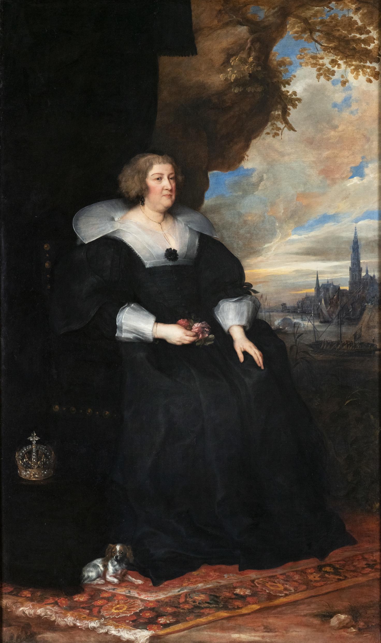 Ce portrait officiel, peint à Anvers, lui confère pourtant un statut royal. Pour le réaliser, Marie de Médicis choisit Anton Van Dyck, un peintre hollandais à la réputation grandissante. Ce dernier la représente idéalisée, trônant en majesté, vêtue d’une robe de deuil noire et tenant dans sa main un bouquet de roses. Pour évoquer sa situation, la couronne royale est posée à ses côtés et non sur sa tête. Toutefois, Marie de Médicis ne s’annonce pas vaincue. La présence du chien, symbole de fidélité, placé au premier plan à gauche, vient souligner tout le dévouement qu’elle porte au Royaume de France, dont les fleurs de lys ornent le rideau situé derrière elle.