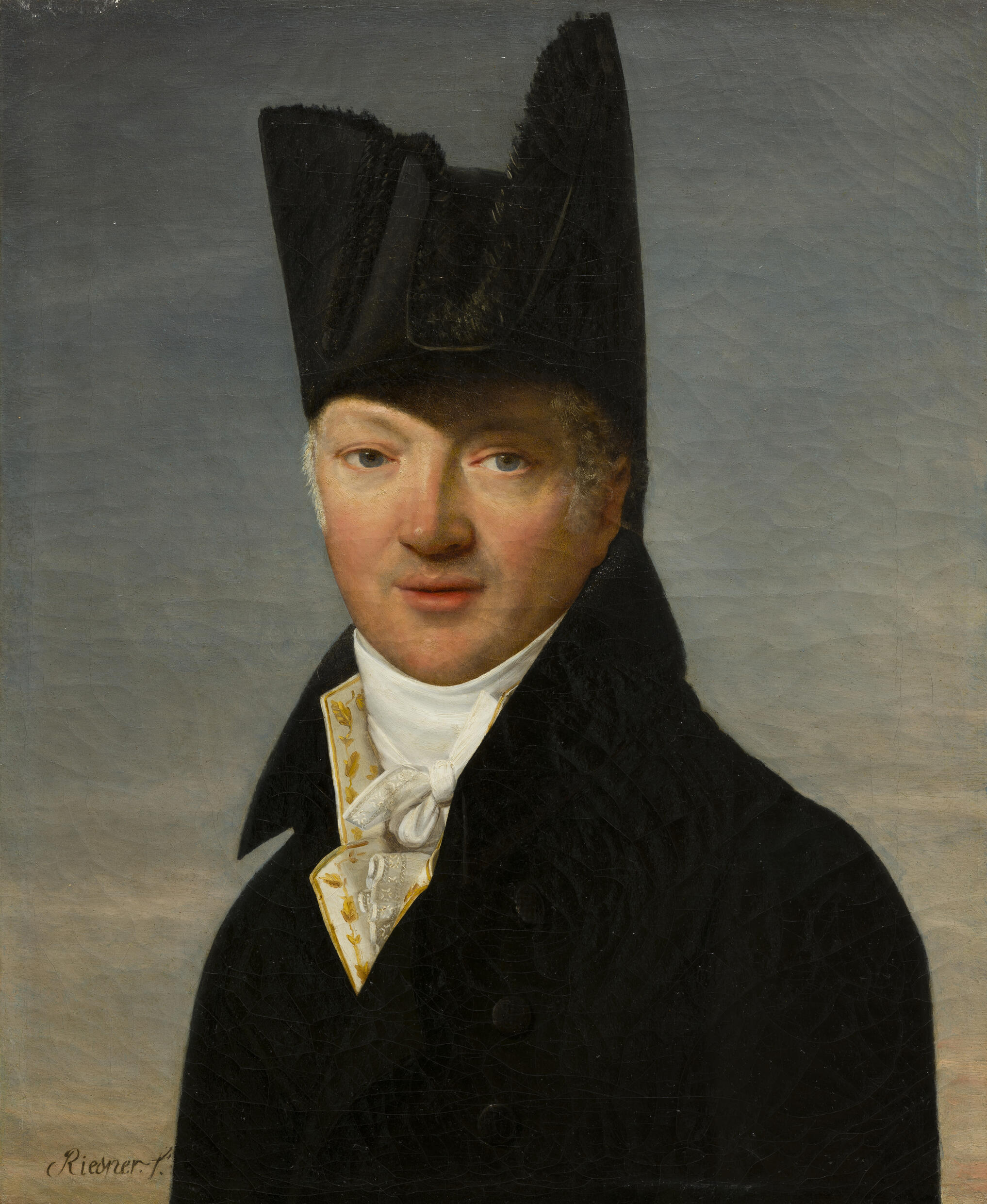 La prédilection de Riesener pour les portraits d’officiers en uniforme est sans doute héritée de son engagement militaire dans ses années de jeunesse. Citons ainsi celui du Colonel Hubert de la Huberdière (1812, MBA de Bernay), reprenant le même fond de ciel tourmenté et le même engoncement du personnage dans son uniforme.