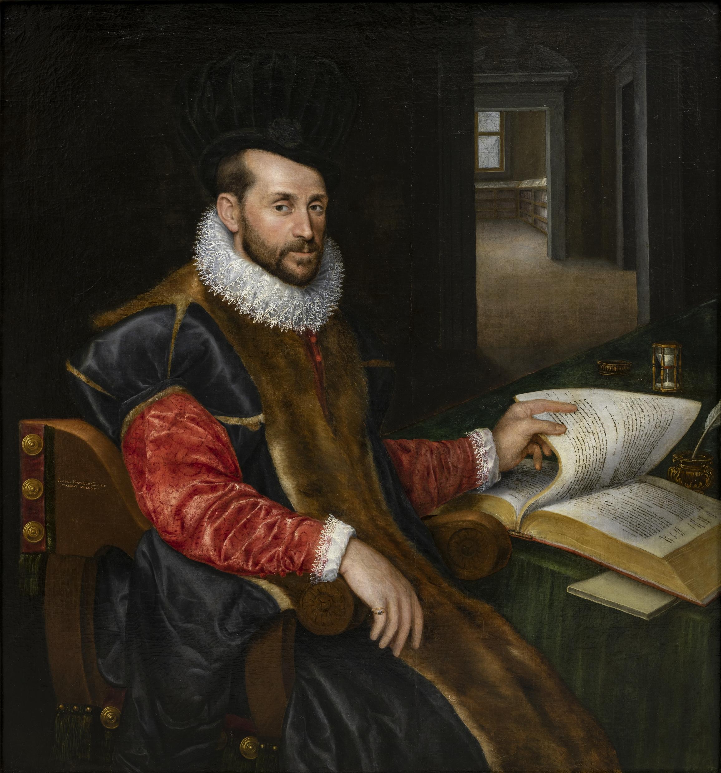 Assis à son bureau et représenté de trois-quarts, le modèle est richement vêtu et tient ouvert un épais manuscrit qu’il vient d’annoter de sa plume. Un carnet glissé sous ce livre, une plume et un encrier indiquent une activité studieuse. Sur le bureau, le sablier mesure le temps et symbolise également son passage inexorable. Le cadre somptueux qui l’environne confirme l’importance du statut social du gentilhomme. À l’arrière-plan se détache un studiolo ou cabinet d’étude rempli de livres, donnant sur une fenêtre symbolisant l’ouverture d’esprit propre à l'humanisme de la Renaissance. La lumière naturelle vient souligner le regard perçant de cet savant lettré.