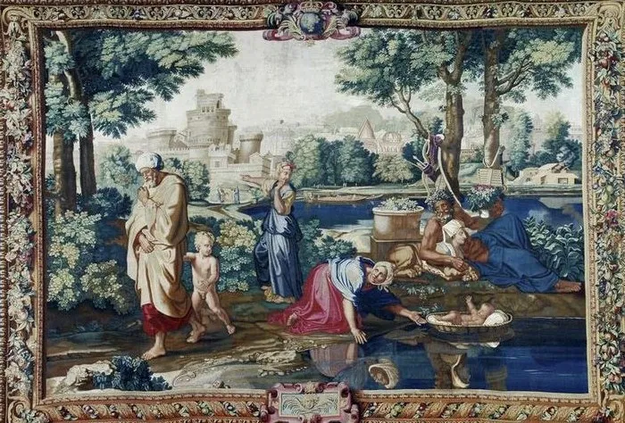 À la mort de Jean-Baptiste Colbert en septembre 1683, le nouveau surintendant des Bâtiments du Roi, François-Michel Le Tellier, marquis de Louvois, imposa une orientation stylistique et iconographique différente à la manufacture des Gobelins en abandonnant le tissage des célèbres tentures de Charles Le Brun (Alexandre, Histoire du Roi). Mais, dès 1683, les ateliers royaux entreprenaient une nouvelle tapisserie sur l’histoire de Moïse à partir de huit tableaux de Nicolas Poussin, alors considéré comme le plus grand peintre français, et de deux de Le Brun, Premier peintre du Roi.