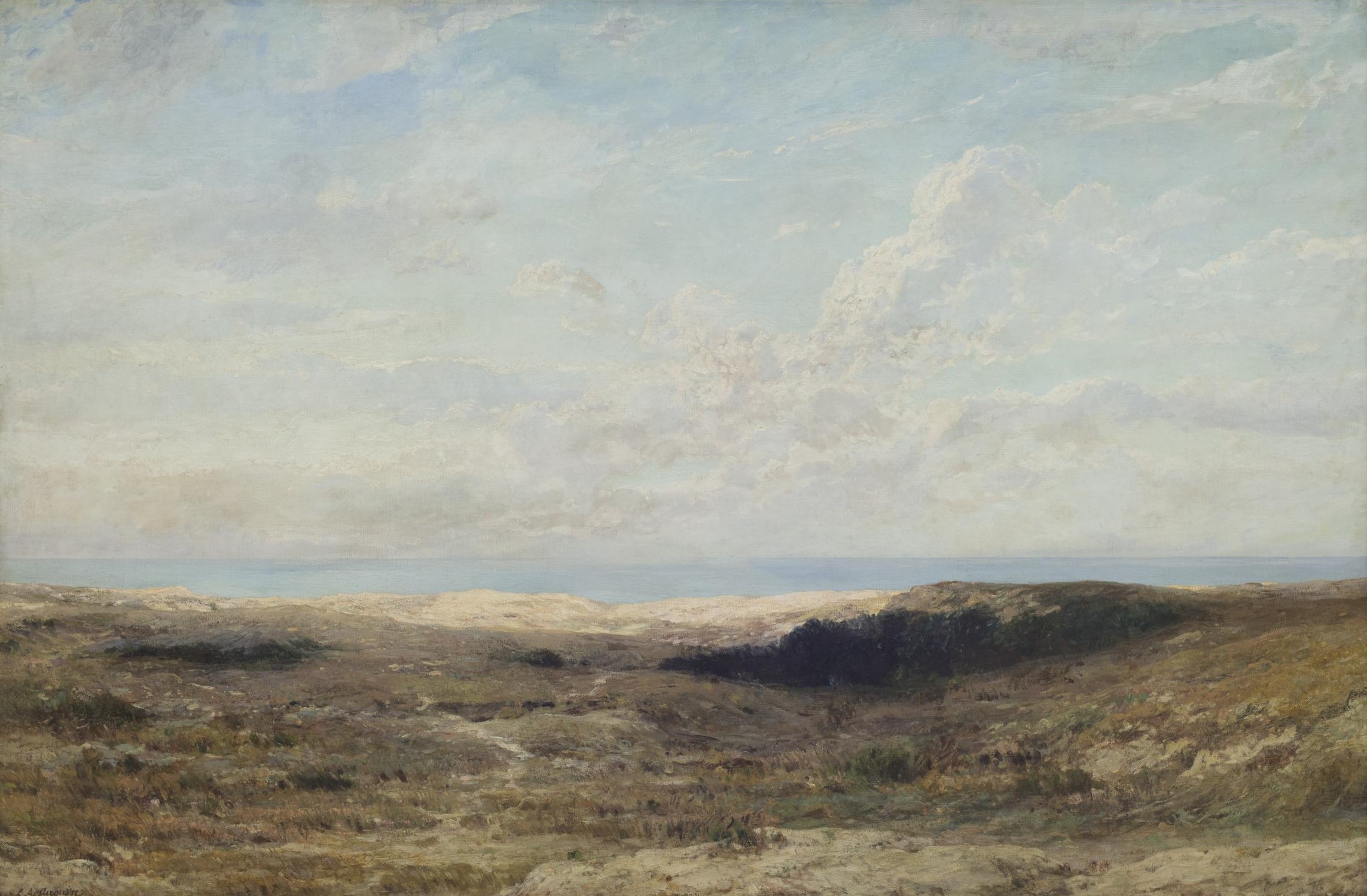 Auguin affectionne les paysages comme celui-ci, aux larges espaces dépouillés et aux horizons lointains, aux lignes floues baignées de lumière. Les dunes, avec leur végétation caractéristique, s’étendent désertes, prolongées par l’océan qui se fond dans un vaste ciel mouvant et lumineux. Adouci de nuages moutonnants, le ciel occupe la majeure partie du tableau, structuré par une ligne d’horizon très basse.
