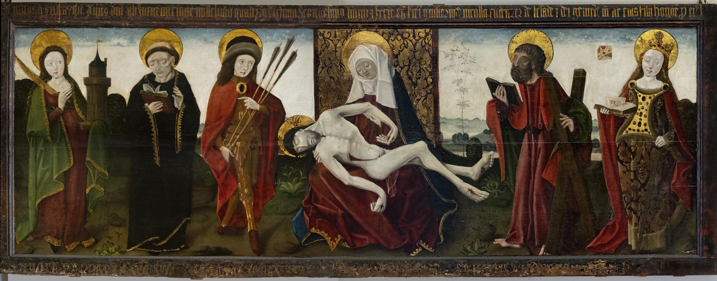 Sur la traverse inférieure du cadre, on peut lire en latin les noms des saints, reconnaissables aussi à leurs attributs. À gauche, sainte Barbe tient dans une main la tour dans laquelle son père la séquestra. Le second personnage est saint Siméon ou Simon : sa tonsure caractéristique de moine évoque une personnalité monastique bordelaise, saint Simon Stock. À la droite de la Vierge de Pitié se trouve saint André, frère aîné de saint Pierre ; il fut martyrisé à Patras, attaché sur une croix en forme d’X. Sainte Catherine d’Alexandrie est la dernière sainte et fait pendant à sainte Barbe avec laquelle elle est souvent jumelée.